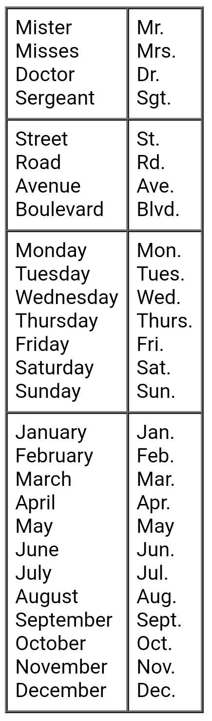 A period is used in abbreviated words or shortened words. Many words can be abbreviated. These are a few common examples.